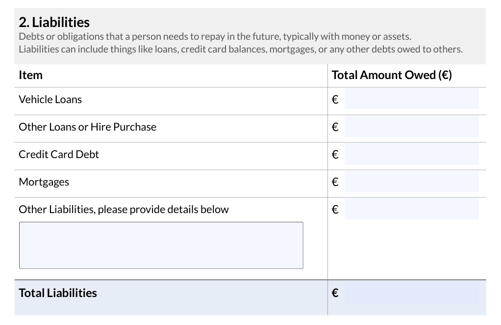 You will then move on to the section that deals with your liabilities. Liabilities are debts that you have so they will include things like rent, mortgage repayments, car loans or credit card debt. Fill out this section and then insert the total liabilities that you have at this time.