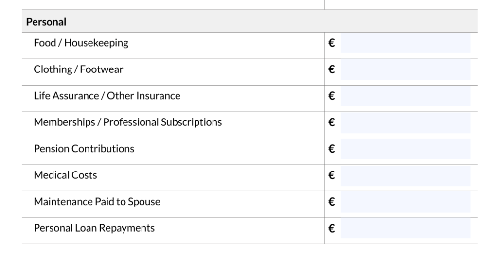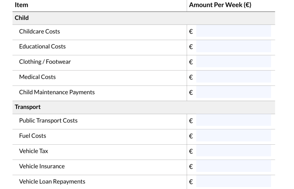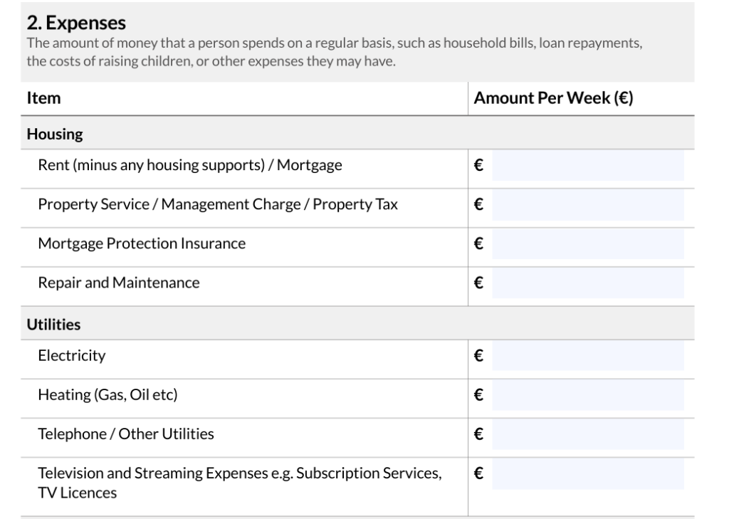 You will then move on to the section of the Statement that deals with your expenses. Once again, this section must be completed on a weekly basis. You should include everything that you spend in the week, and take some time to think about the costs that you have. Everything should go into the Statement of Means so that it can be considered on the hearing date. The expenses are divided into a number of headings – Housing, Utilities, Personal, Child, Transport and Other.